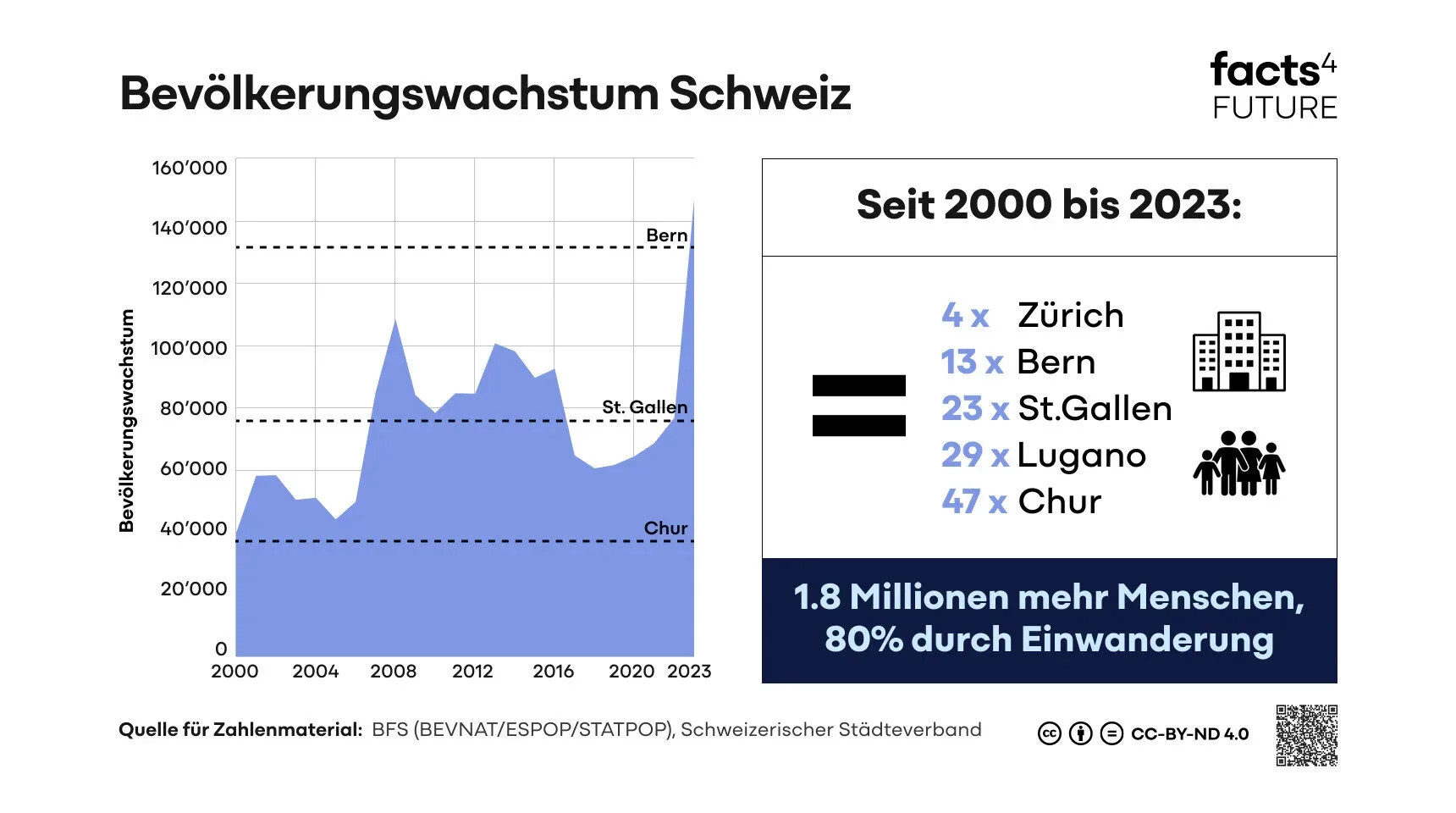Bis heute fehlen belastbare Daten darüber, wie sich die wirtschaftsgetriebene Zuwanderung auf zentrale Bereiche der öffentlichen Infrastruktur auswirkt: ÖV, Strassen, Schulraum, Wohnungsmarkt, Stromversorgung, Gesundheitswesen, Bildung, Biodiversität oder die Erreichbarkeit der Pariser Klimaziele. Ebenso wenig bekannt ist die Gesamtbilanz der Zuwanderung unter Einbezug volkswirtschaftlicher, gesellschaftlicher und ökologischer Auswirkungen.